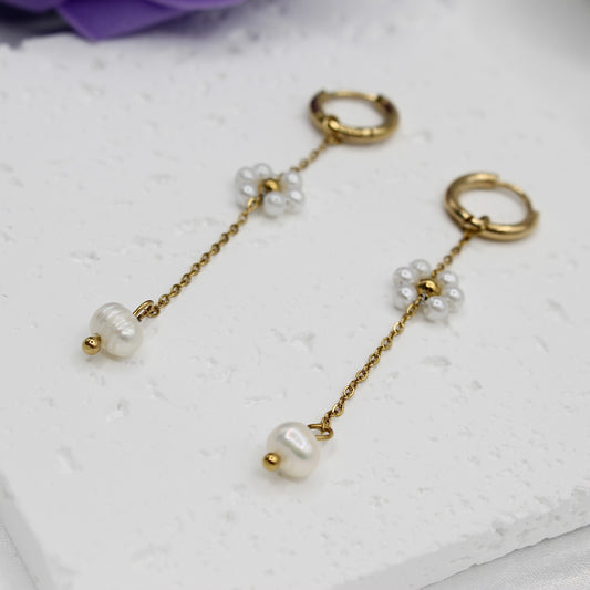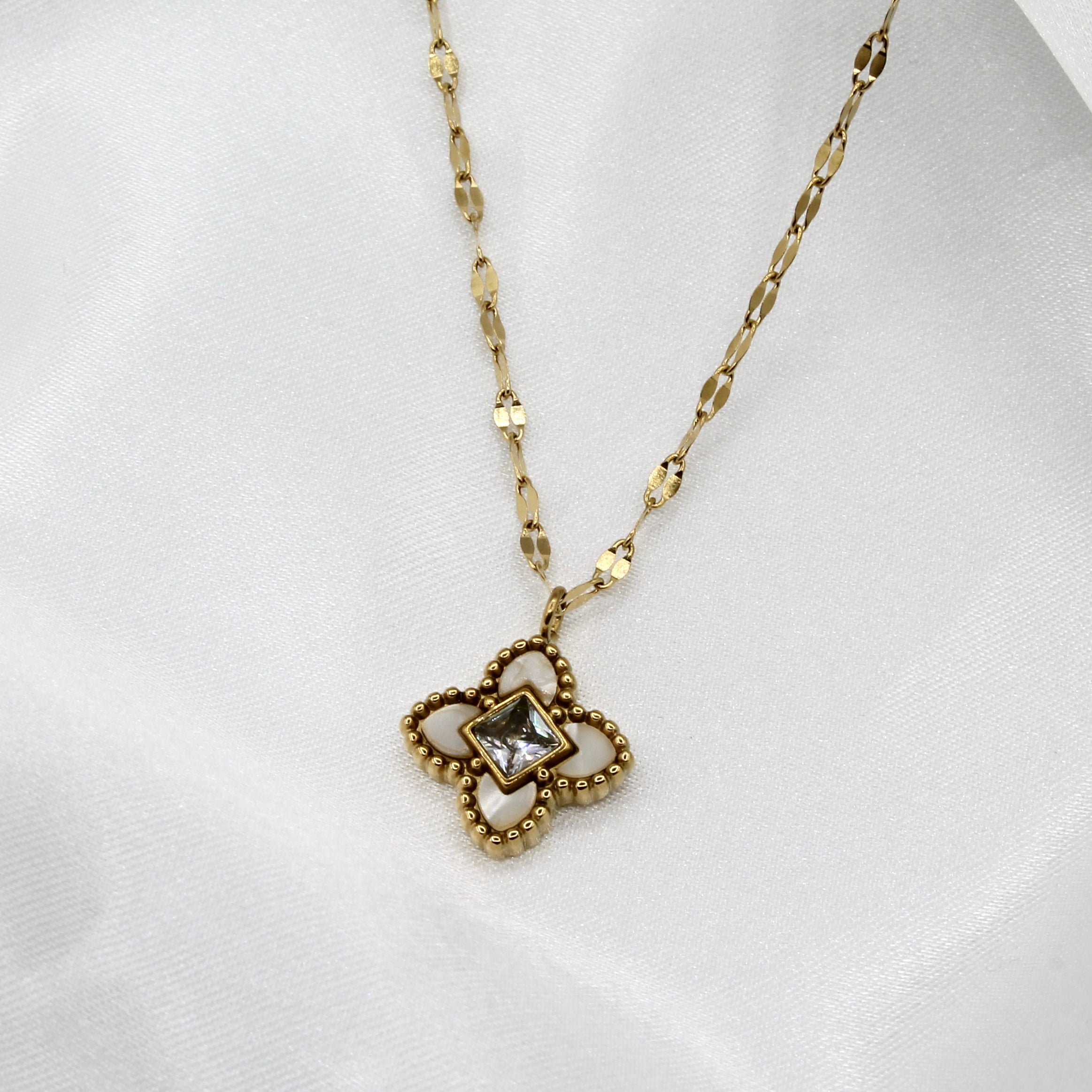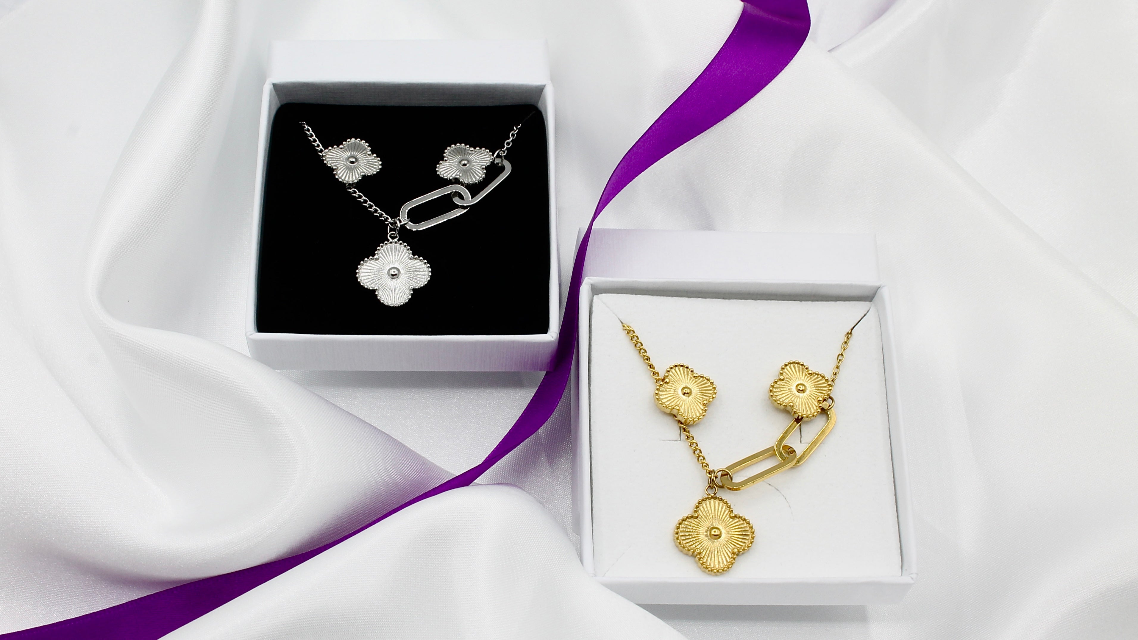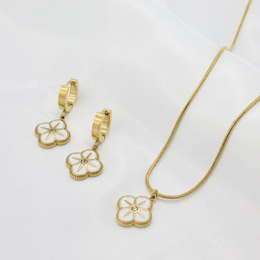 Elevate Your style with this stunning white flower design jewelry set! 18K gold-plated stainless steel, hypoallergenic, tarnish-free and waterproof. Long lasting shine. Perfect for any occasion. Treat yourself or your loved ones with this stunning jewellery set.